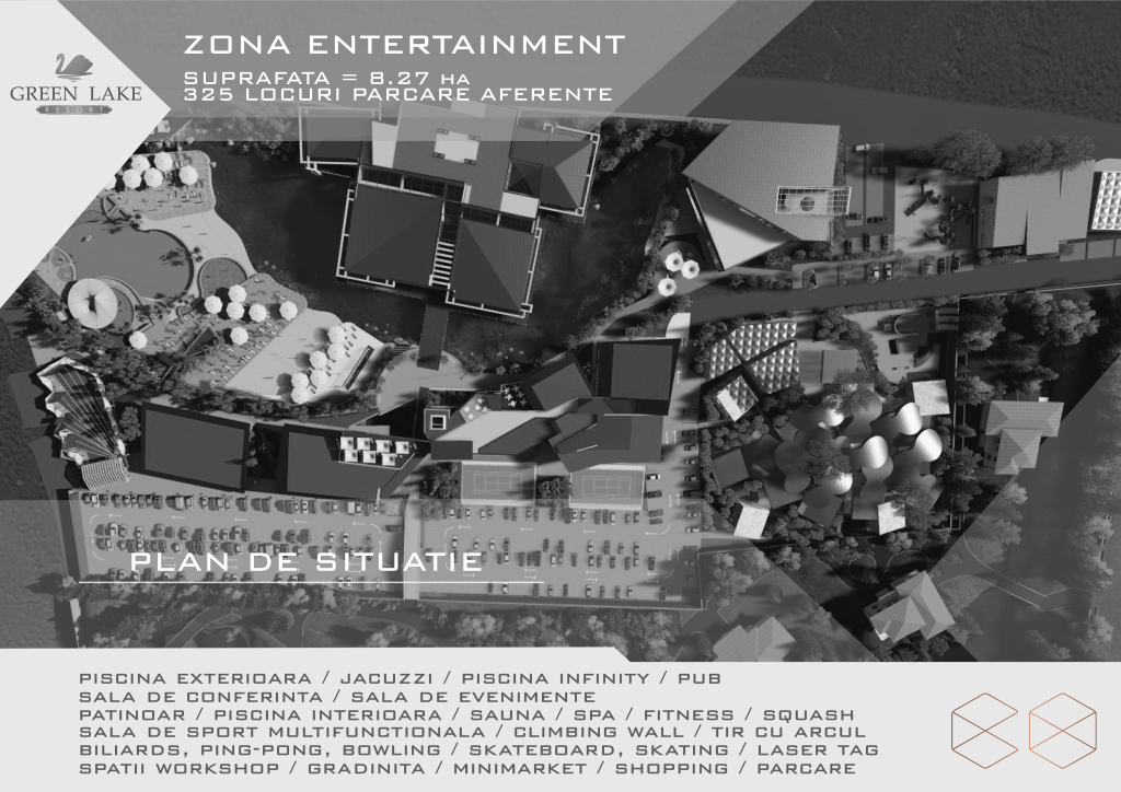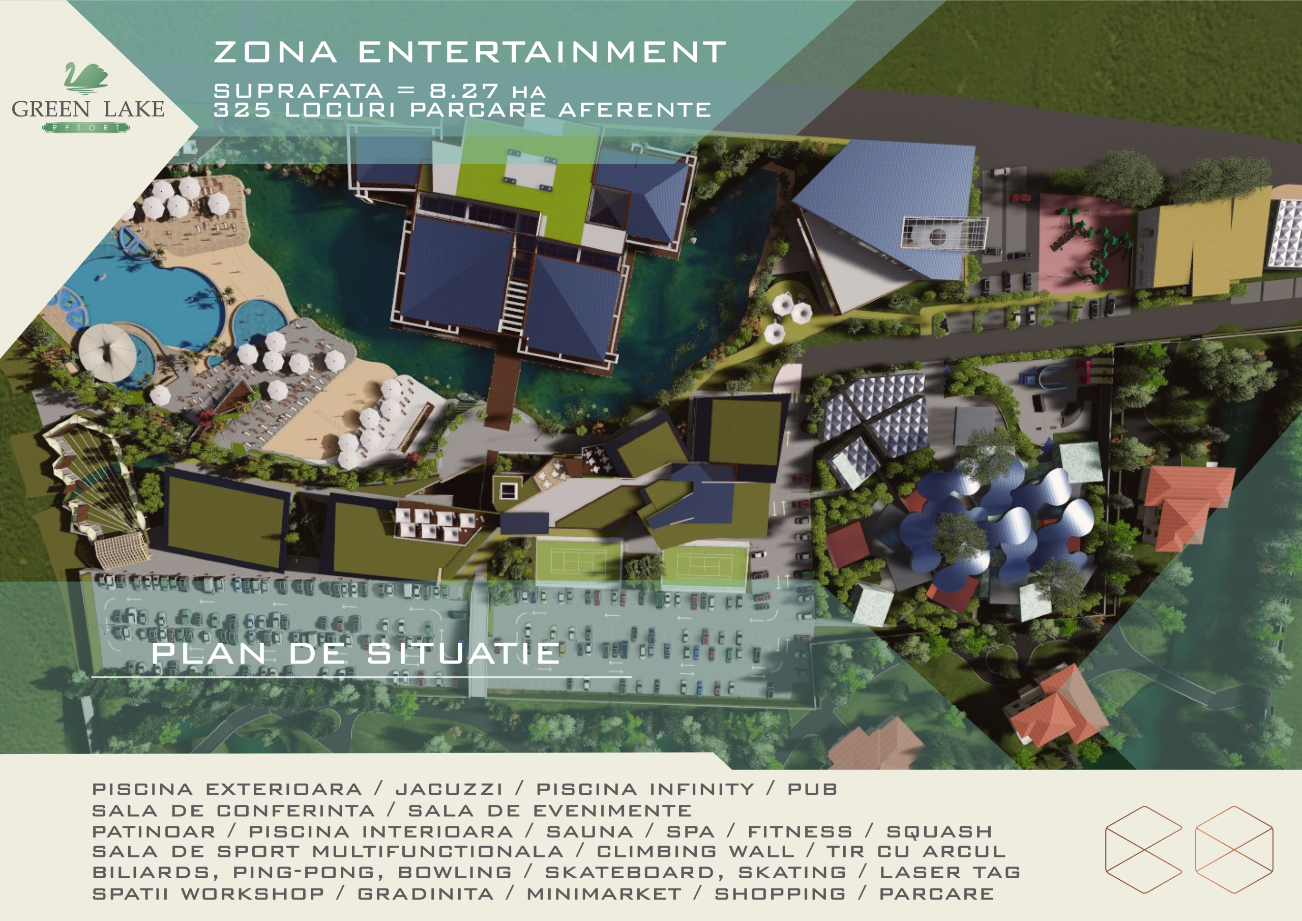 Zona de divertisment include sali de evenimente cu o capacitate totala de 1000 de persoane, cinci sali de conferinte cu o capacitate totala de 336 de persoane, piscina exterioara cu o capacitate de 300 de persoane, ce cuprinde jacuzzi, piscina infinity si teren de volei. De asemenea, zona dispune de pub cu terasa, tir cu arcul, piscina interioara, sauna, spa, sala de sport multifunctionala, gym, squash, fitness, biliard, snooker, ping-pong, bowling, laser tag, escape room, patinoar, climbing wall, gradinita, zona de workshop si activitati pentru copii, skateboard, skating, loc de joaca, pista de biciclete, minimarket, zona de shopping si parcare.