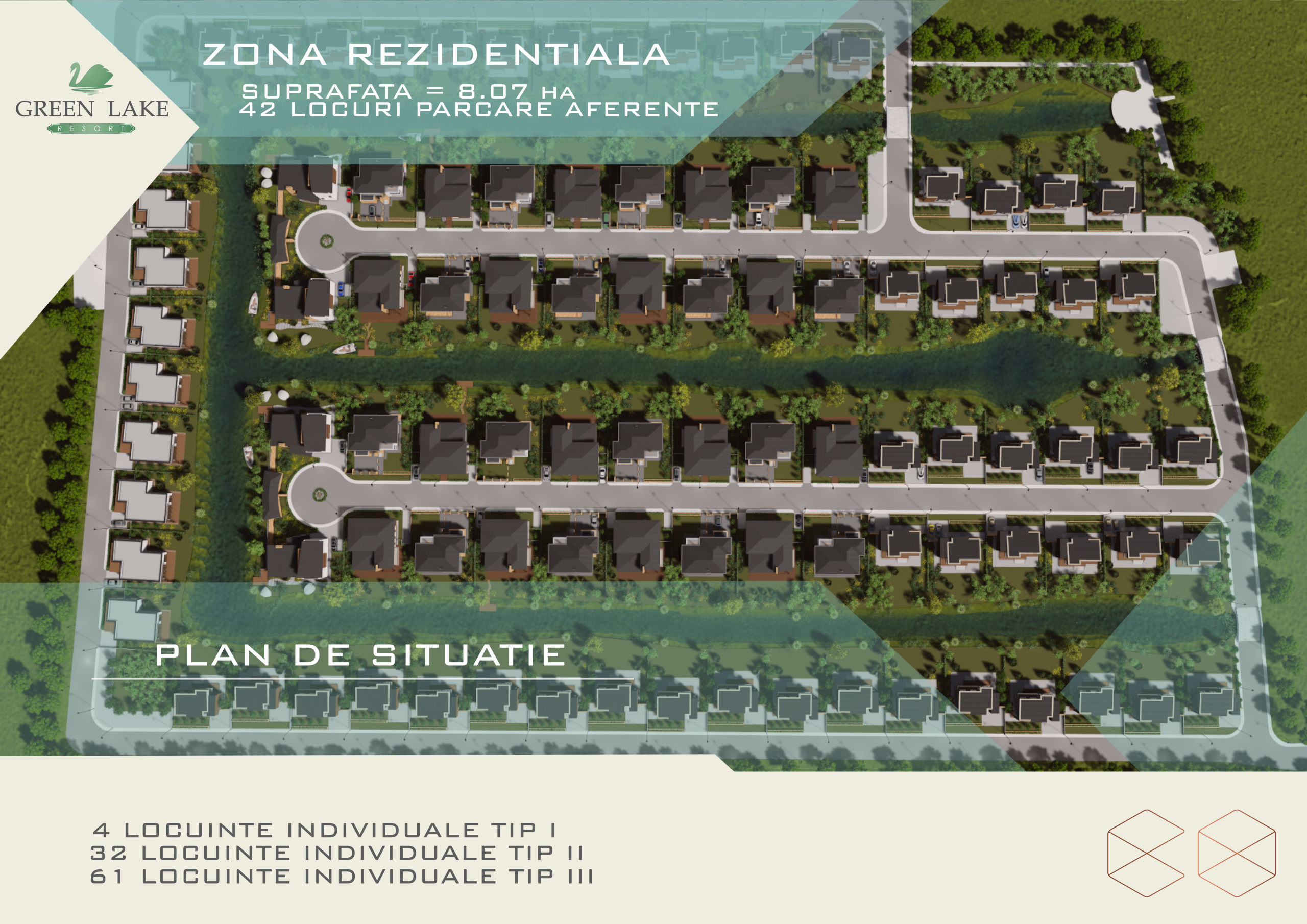 Zona rezidentiala cuprinde 97 de locuinte individuale, fiecare beneficiind de doua locuri de parcare si acces direct la un lac artificial propus. Adiacent au fost prevazute 42 de locuri de parcare pentru vizitatori.