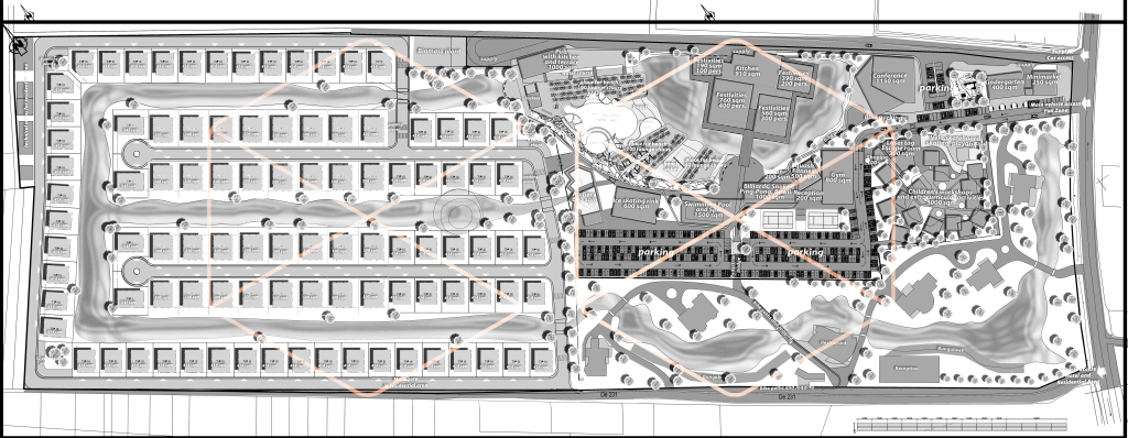 Receptia, restaurantul, cele 5 locuinte individuale si lacul, situate in zona de sud-est, sunt existente. De-a lungul acestui lac sunt propuse doua zone pentru bungalow-uri.